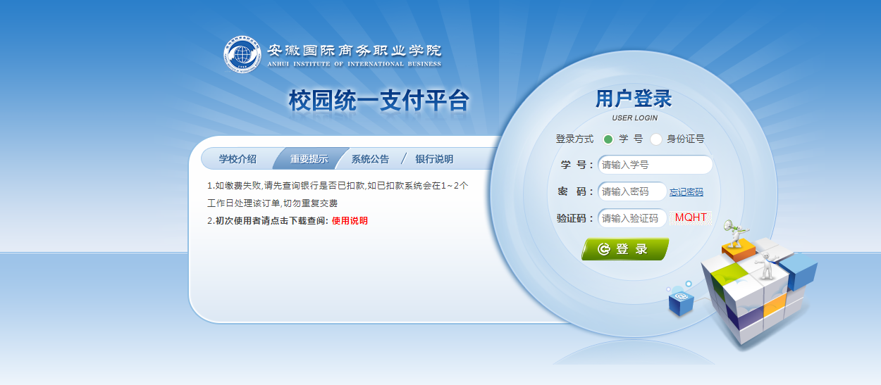 首先,祝贺您成为安徽国际商务职业学院2023级新同学。请新同学及家长仔细阅读以下内容。学校通过“安徽国际商务职业学院校园统一支付平台”收取学费,请于开学报到前登陆平台自助完成缴费。
